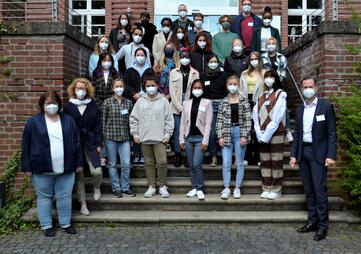 (Singen). Am 1. April 2021 ist ein neuer Ausbildungskurs in der generalistischen Pflege mit 27 TeilnehmerInnen an der Krankenpflegeschule Standort Singen gestartet. Die Kursleitung hat Pflegepädagogin Susanne Philipp übernommen (im Bild links außen), die gemeinsam mit Akademieleiterin Dr. Bettina Schiffer (2.v.l.) sowie Tobias Müller, Geschäftsbereichsleiter Personal und Recht (re außen), im Mai bei einem Präsenztag die neuen Auszubildenden herzlich willkommen hieß. (Bild: Jagode)
